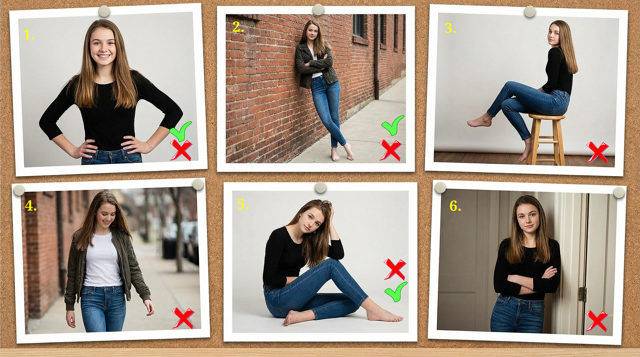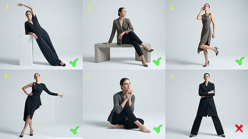 Es gibt zwar sehr viele verschiedene Posings, jedoch sind alle nutzbar, je nachdem was man ausdrücken möchte. Auch Stilbrüche sind okay, wenn man sie bewusst einsetzt und vielleicht sogar noch krass übertreibt. In den Beispielposen weiter unten ist so ein Beispiel die Nr. 6. Eigentlich ungünstig, weil sie keine der von Profis empfohlenen Aspekte umsetzt, wie zum Beispiel die Dreieckbildung mit Armen und/oder Beinen, eine schräge Körperdrehung (45°) zur Kamera oder asymmetrische Gliederhaltungen. Doch genau diese Pose kann mit dem richtigen Licht, Gesichtsausdruck, passender Kleidung/ Accessoires und anderen Aspekten die beste aller Posen sein. Es gibt eben keine verbindliche Regel oder Vorgabe. Das macht es so spannend.