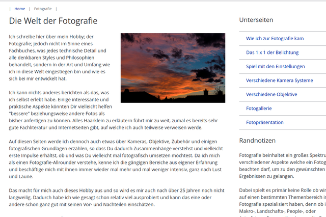 Wer sich für Fotografie interessiert kann sich gerne meinen Fotografie-Bereich auf meiner Website anschauen, welcher ständig weiter wächst; so wie ich Lust und Laune habe daran weiter zu schreiben.